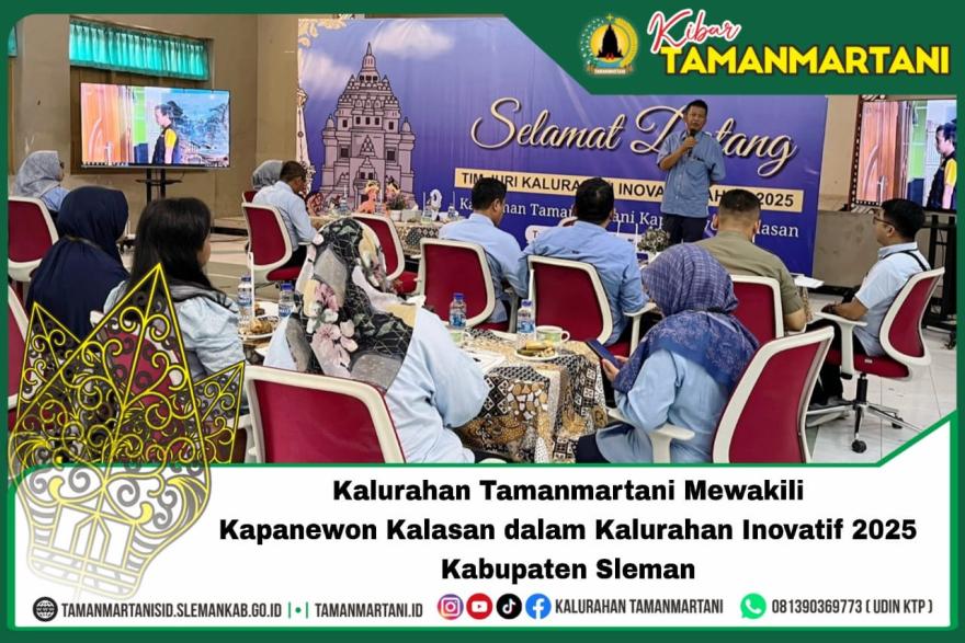 Tamanmartani (12/11) - Kalurahan Tamanmartani mewakili Kapanewon Kalasan dalam Penilaian Kalurahan Inovatif 2025 tingkat Kabupaten Sleman. Kunjungan tersebut dilaksanakan pada Selasa, 11 November 2025 bertempat di Gedung Kalurahan Tamanmartani yang mana disambut oleh Gandang Hardjanata selaku Lurah Tamanmartani beserta jajaran perangkat dan kelembagaan kalurahan. Kunjungan tim juri kali ini di pimpin oleh Ekowati dari Dinas Pemberdayaan Masyarakat Kalurahan (DPMK) Kabupaten Sleman.