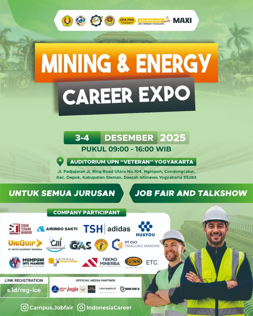 Ayo hadir dalam Mining & Energy Career Expo 2025 yang diselenggarakan oleh UPA Pengembangan Karir dan Kewirausahaan UPN Veteran Yogyakarta.