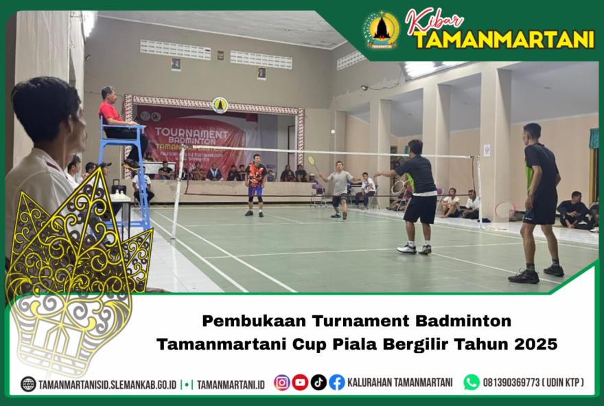 Telah terlaksana pembukaan Turnament Badminton Tamanmartani Cup dalam rangka piala bergilir Kalurahan Tamanmartani se-Tamanmartani pada Sabtu, 27 September 2025 bertempat di Gedung Aula Kalurahan Tamanmartani. Berikut ada sebanyak 17 Padukuhan yang mengikuti turnamen tersebut: Padukuhan Carikan, Klurak, Sentono, Bogem, Sepetmadu Kenaji, Cageran, Pakem, Dalem, Kepatihan, Tamanan Pabrik, Karangmojo, Kebon, Tegalrejo, Jongkangan, Pucung, Keniten dan Randugunting.