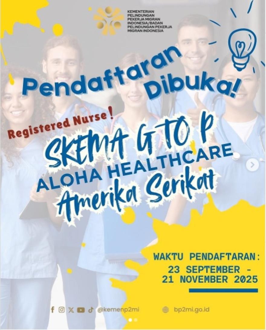 Bagi #SobatMigran Perawat, mari wujudkan mimpi ke Amerika Serikat! Dibuka pendaftaran Skema G to P Aloha Healthcare dengan jabatan Registered Nurse. Pendaftaran dibuka dari 23 September 2025 hingga 21 November 2025.
